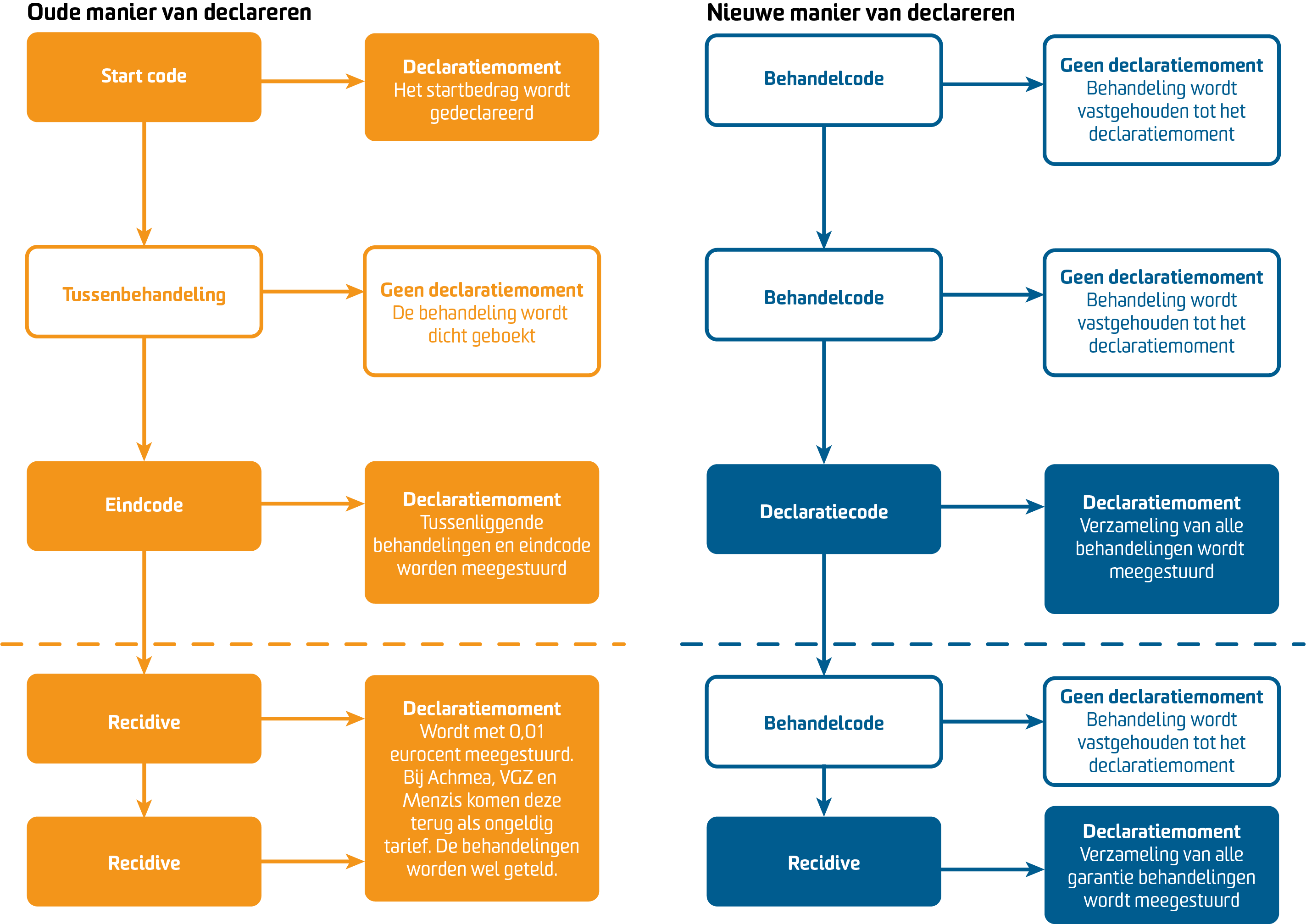 Let op: Als een patiënt binnen 6-12 maanden (afhankelijk van het profiel) terugkomt voor dezelfde klachten, moeten deze behandelingen allemaal als recidive worden opgestuurd. Ondanks dat een deel van deze behandelingen mogelijk buiten de initiële garantieperiode valt. Je werkt dus door in het bestaande traject van de patiënt. Plan tussenliggende behandelingen in, tot de patiënt is uitbehandeld, en stuur deze op aan de zorgverzekeraar door de recidive code in te plannen en te declareren.
