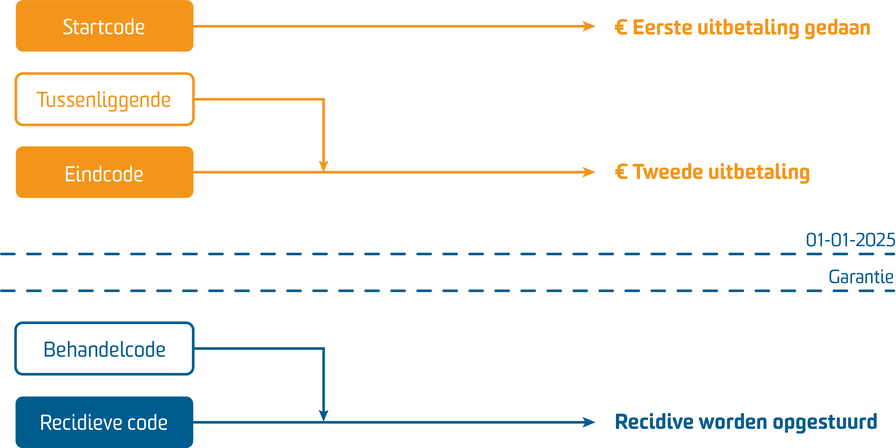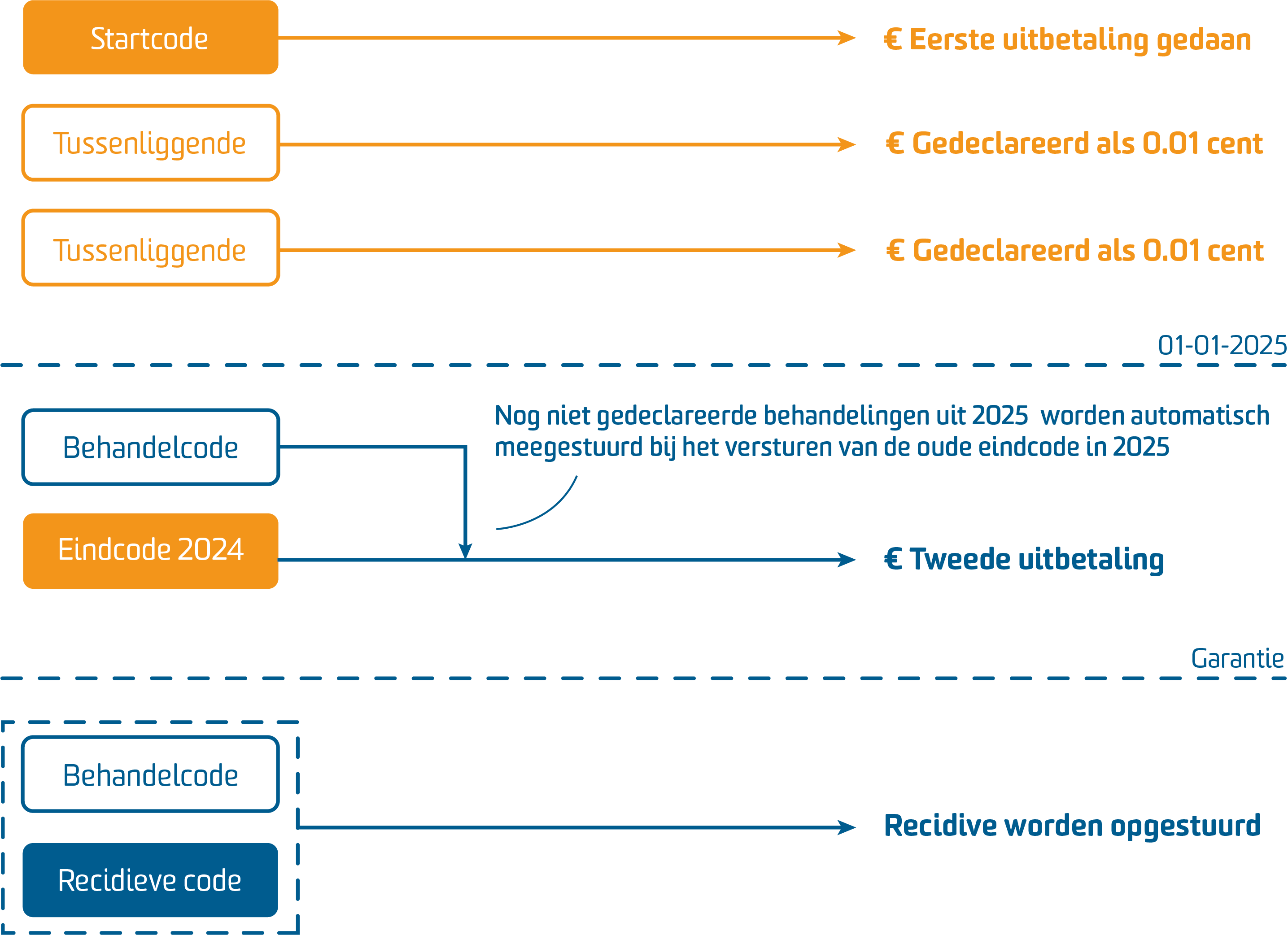 In dit geval kunt u het traject heropenen en de nieuwe codes gebruiken voor de recidive behandelingen. U gebruikt de behandelcodes en bij de laatste behandeling sluit u af met de recidive code. Alle behandelcodes in de garantieperiode worden automatisch verzameld en opgestuurd naar de zorgverzekeraar zodra de recidive code wordt gedeclareerd.