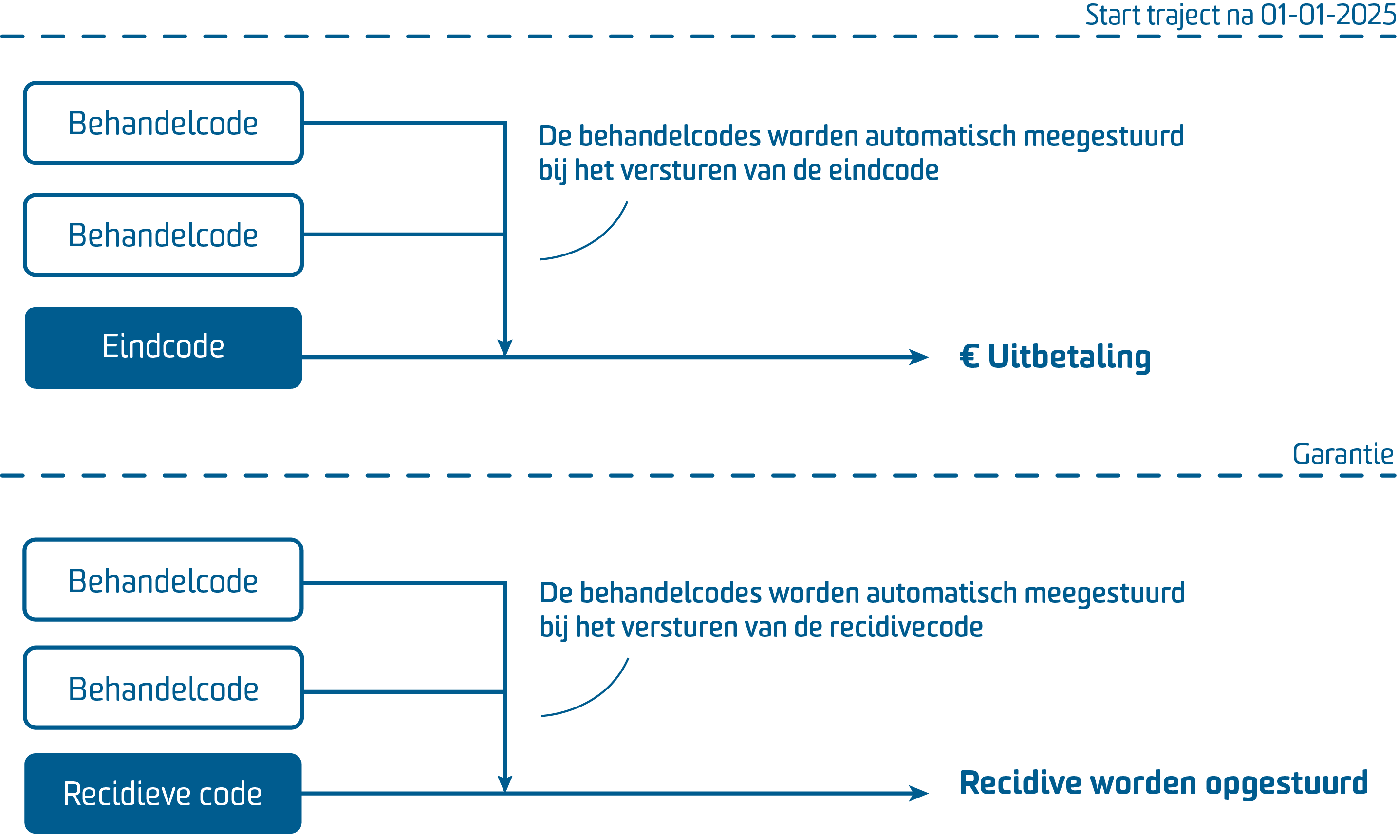 In plaats van dat u een startcode gebruikt zoals in 2024, begint u het traject met een behandelcode. Deze code gebruikt u ook voor alle opvolgende behandelingen. U sluit het traject met een eindcode. De eindcode telt de behandelcodes en stuurt deze mee naar de zorgverzekeraar.