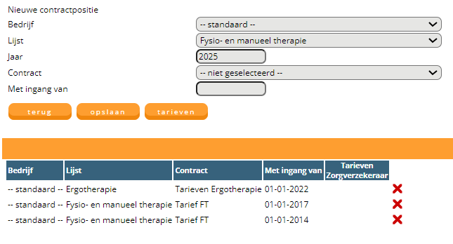 Om het juiste contract te koppelen, gaat u naar Configuratie > Algemeen > Contractposities > Open de zorgverzekeraar in kwestie met het kladblok > Selecteer indien nodig het bedrijf > Selecteer de lijst: ‘Zorgtopics 2025’> Kies Peiljaar: 2025 > Selecteer het juiste contract > Kies met ingang van: 01-01-2025 > Sla op.