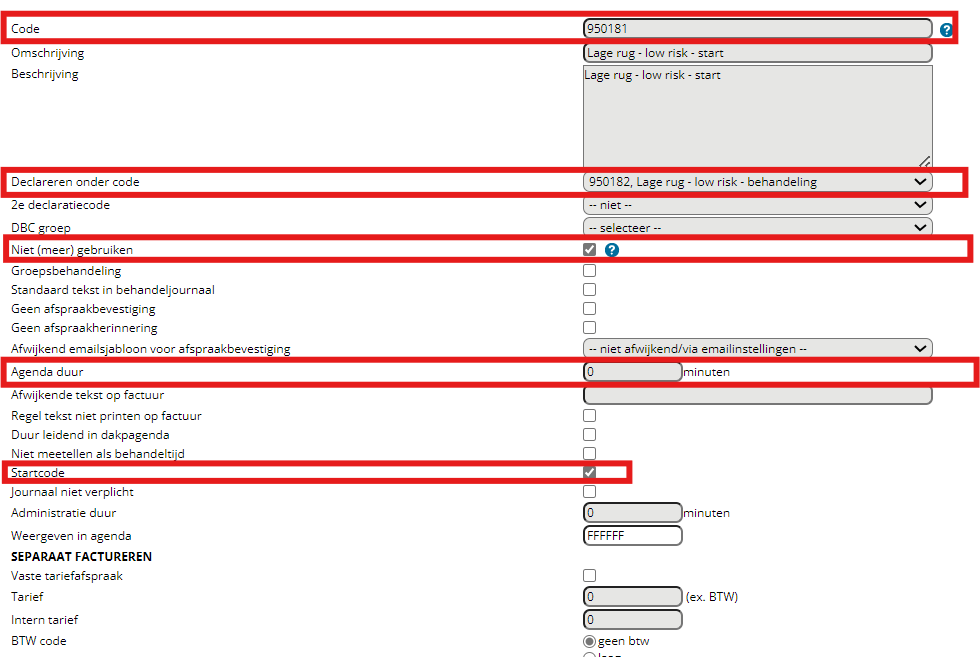 De reden is dat de startcode aan dezelfde declareren onder code moet hangen als de behandelcode. Dit wordt hetzelfde behandeld door de zorgverzekeraar, maar de startcode is nodig voor Intelligence. Ook kunt u bij “weergeven in agenda” eventueel een andere agendakleur toewijzen voor de intake.