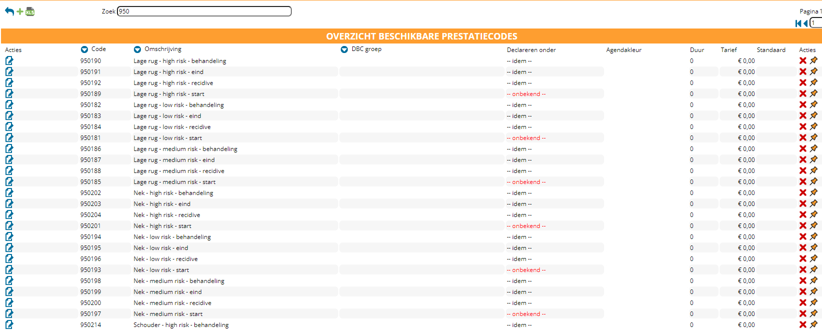 We hebben voor u de prestatiecodes klaargezet in FysioOne, zodat u deze makkelijk kunt configureren. U vindt deze als u naar configuratie > Declareren > Prestatiecodes gaat en in de zoekbalk zoekt op “950”.
