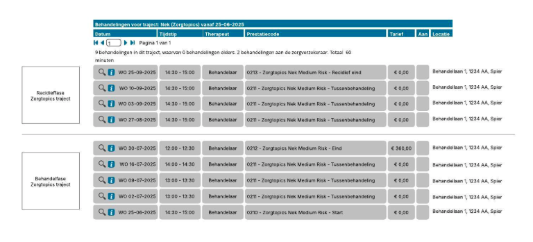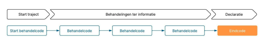 Net zoals in de behandelfase worden afspraken geregistreerd met de behandelcode als prestatiecode. De behandelcode wordt “ter informatie” meegestuurd naar de zorgverzekeraar wanneer u de eindcode declareert. U kunt de behandelingen gewoon boeken en declareren. De declaratiemodule houdt de behandelingen vast totdat u de eindcode declareert. In het tabblad traject worden deze behandelingen lichtgrijs weergegeven, en wanneer u met de muis over het i-icoon gaat, ziet u de melding “is zorgproduct” verschijnen. Deze werkwijze komt overeen met de actuele instructies binnen Zorgtopics en sluit aan op de eisen van de declaratieflow voor zorgverzekeraars.