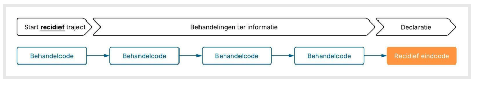 Let op: Er kan meerdere keren sprake zijn van een recidief. Dit gebeurt wanneer een patiënt herhaaldelijk klachtenvrij is verklaard (en het behandeltraject wordt afgesloten), maar binnen de garantieperiode toch weer terugkeert met dezelfde klachten. Iedere keer dat dit gebeurt, wordt de recidief-procedure opnieuw toegepast, volgens onderstaande flow. Dus met een nieuwe behandelcodes en een nieuwe eindcode