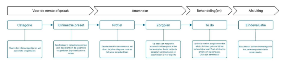 In het zorgplan staan alle acties die tijdens de behandeling uitgevoerd moeten worden, zoals het afnemen van klinimetrie en het maken van rapportages. Het zorgplan is daarnaast belangrijk voor de export van gegevens. Het zorgplan wordt automatisch klaargezet via het profiel, maar u kunt het altijd aanpassen bij het behandelplan in het dossier.