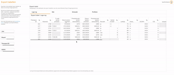 Therapeut/Patient ID: het is mogelijk om te filteren per therapeut of patiënt. Klik hiervoor op het vergrootglas.