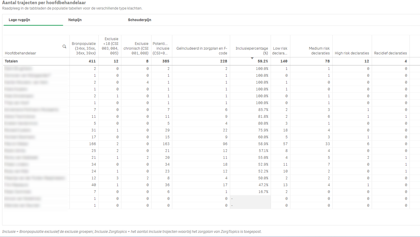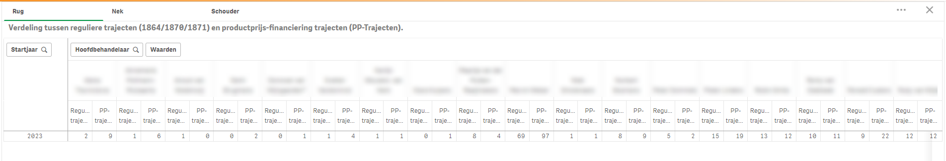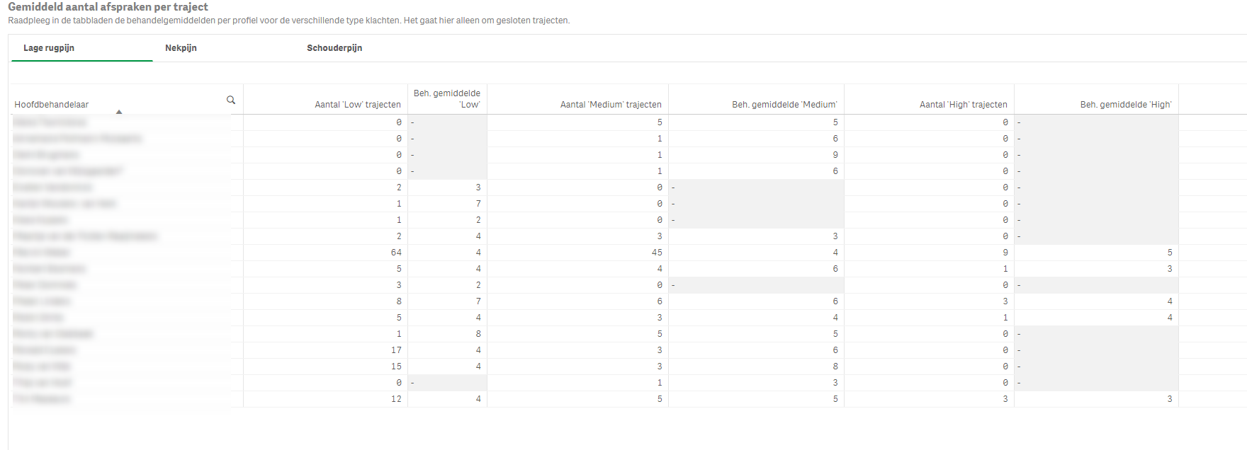 In de praktijkvoering kan het handig zijn om dit op de hoofdbehandelaar uitgesplitst te hebben. Hiervoor kijk je naar de rest van de tabel om te monitoren hoe dit in de praktijk gaat.