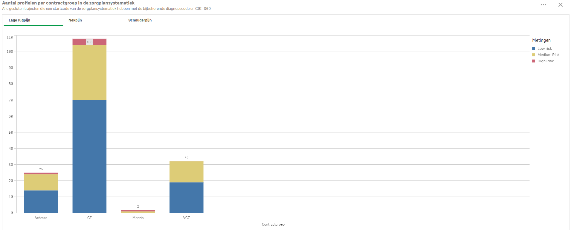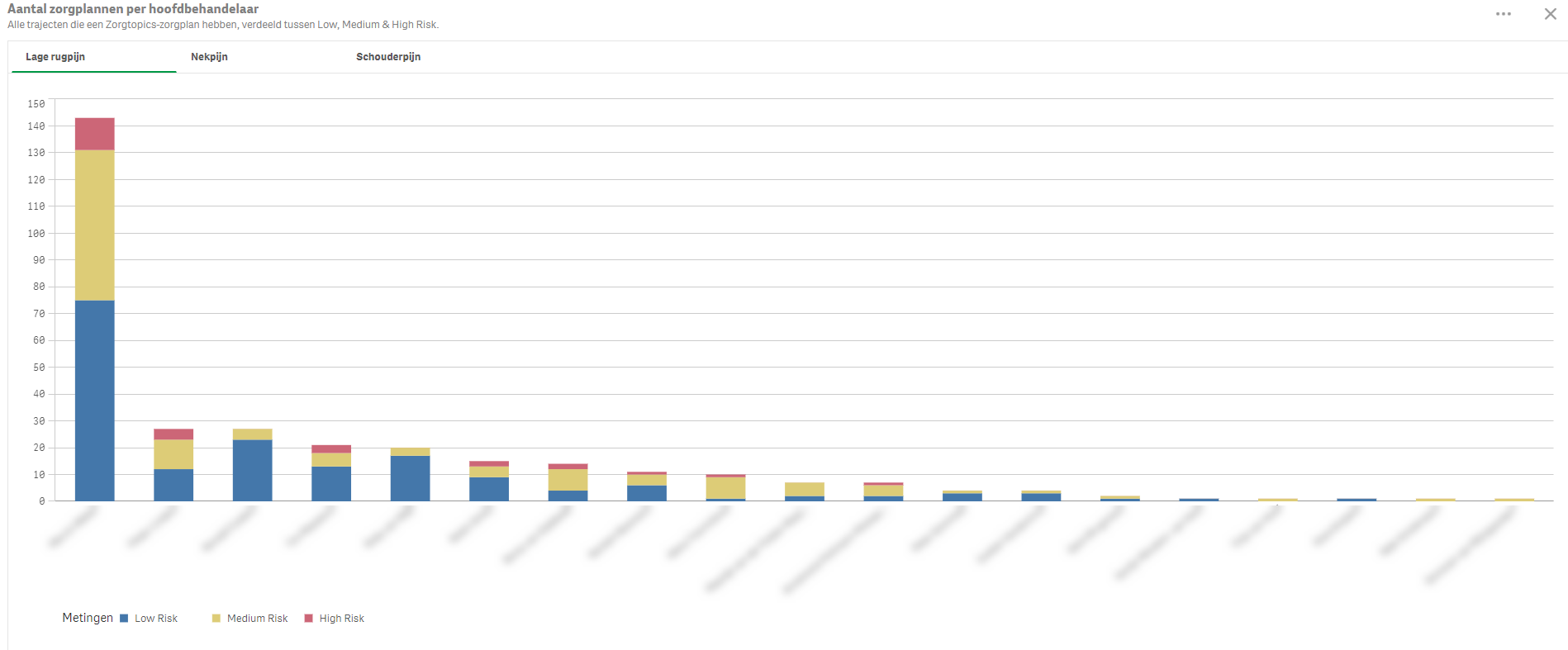 In deze staafgrafiek zie je in één oogopslag welke hoofdbehandelaar hoeveel trajecten van een bepaalde categorie ziet en daarbij de verdeling van de zorgzwaarte. Deze kan je goed gebruiken om de verdeling (low/medium/high) per therapeut te monitoren of deze niet te veel afwijkt bij de verdeling die CZ bijvoorbeeld in hun addendum voor productprijsfinanciering opneemt.