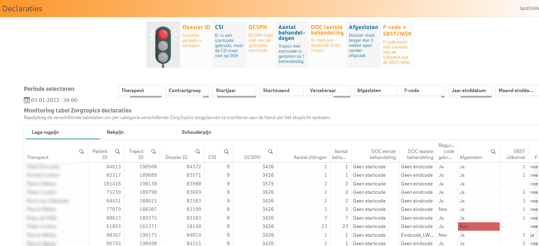 Alleen dossiers met DCSPH 3426, CSI 009, een zorgplan en toestemming van de patiënten werden in de tabel getoond.