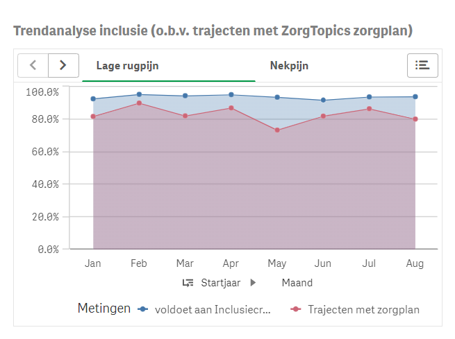 Hier kun je bijvoorbeeld een vergelijking maken tussen twee behandelaren op basis van inclusiepercentage. Welke behandelaren gebruiken de zorgplannen met regelmaat en welke niet?