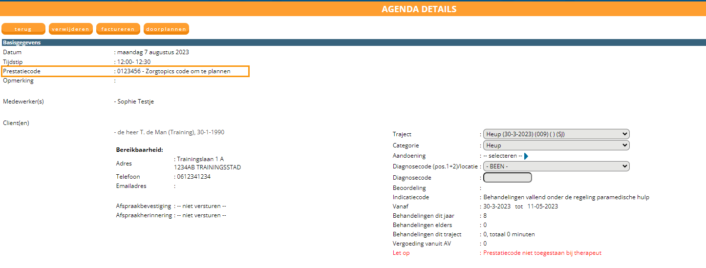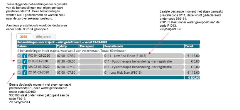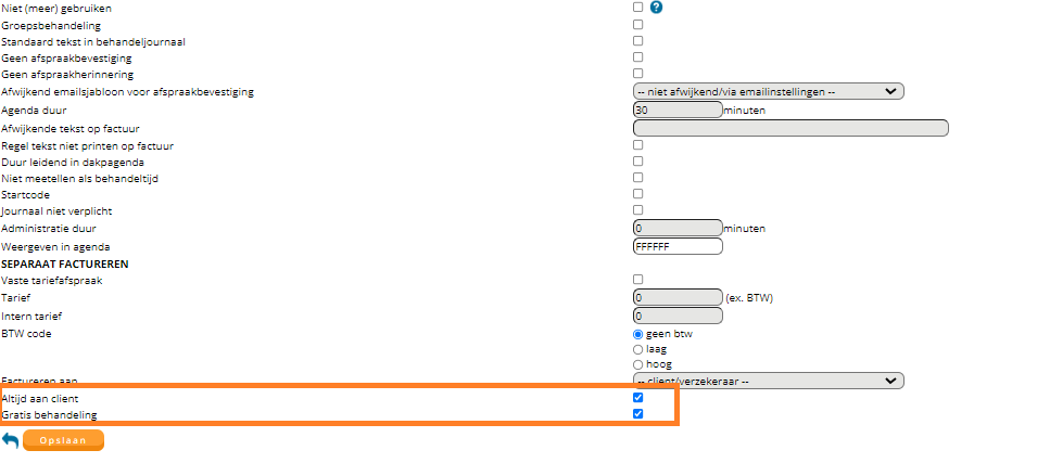 Let op: Voor zorgverzekeraar Achmea dient u de tussenliggende afspraken in te sturen, bij de andere verzekeraars moeten deze “dicht geboekt” worden. Hiervoor moeten andere prestatiecodes worden aangemaakt. Deze worden dan bij de eindcode meegenomen naar de verzekeraar. Dit wordt gedaan door te declareren onder de code 930134 en onderaan Altijd aan cliënt en Gratis behandeling aan te vinken.