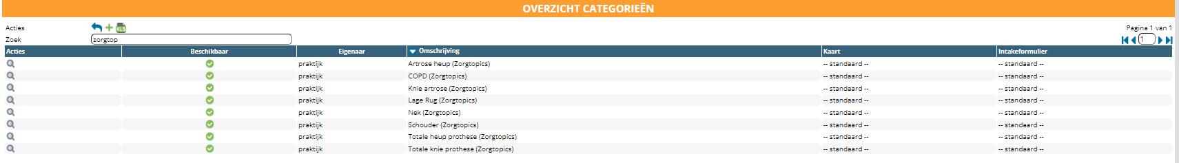 Deactiveer alle profielen van Zorg1 en FysioTopics. Filter de zorgplannen door middel van de zoekterm “Zorg1” of “FysioTopics”. Kijk ook naar de kolom “categorie”. Deze profielen hebben een categorienaam die “Zorg1” of “FysioTopics” in de naam heeft.