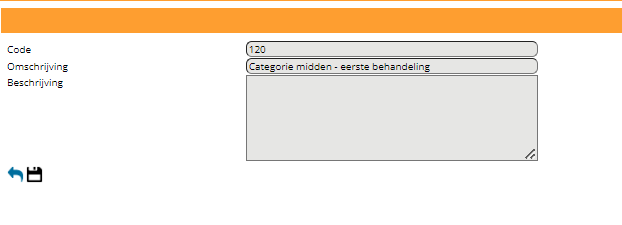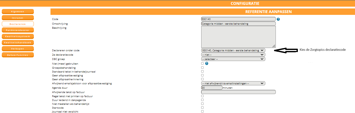 Hier kiest u bij ‘Declareren onder code’ een van de codes/naam verrichtingscodes die overeenkomt met het type prestatie welke u aan het inrichten bent (bijv. de code behorende bij prestatie “Categorie midden – eerste behandeling”). De ‘declaratie onder code’ is op de achtergrond gekoppeld aan de bij u bekende F-code en wordt verstuurd naar de zorgverzekeraar. Aan deze code wordt het tarief gekoppeld, ingericht bij de contracttarieven.