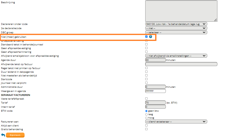 Bij de omschrijving vult u de gewenste omschrijving in van de prestatiecode. Dit is de naam van de prestatiecode die getoond wordt bij het inplannen van een afspraak. Let erop dat u een duidelijke en herkenbare naam kiest, zodat u de juiste prestatiecode kunt kiezen bij het inplannen van een afspraak.