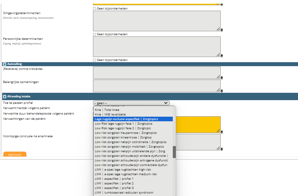 Het profiel wordt geselecteerd in de anamnese. Op basis van het profiel wordt automatisch de juiste diagnosecode, CSI code en zorgplan geregistreerd in het dossier.