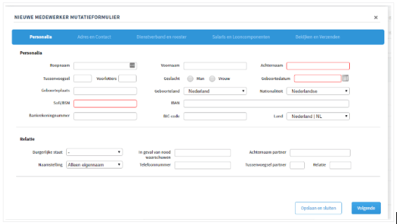 Dit mutatieformulier heeft meerdere onderdelen. Klik op volgende of bovenin om naar de andere tabs te gaan. Vul alle velden in. De rood omrande velden zijn verplicht.