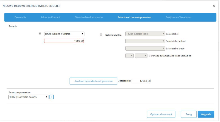 Let op: vergeet niet om eenmalig het Jaarloon BT in te voeren (Dit is 12,96 maal het bruto maandsalaris).