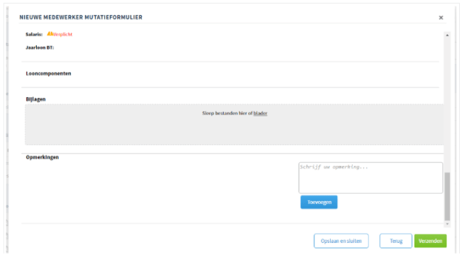 In het volgende scherm kunt u bijlagen toevoegen. Voeg hier de arbeidsovereenkomst, een kopie opgave voor de loonheffingen en een kopie van het paspoort/ID bewijs toe (geen rijbewijs). Deze documenten zijn noodzakelijk voor een correcte controle en verwerking van de gegevens.