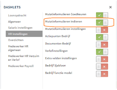 Dan verschijnt het onderstaande scherm. Kies hier voor ‘HR Instellingen’ en klik vervolgens op het veld achter ‘Mutatieformulieren Indienen’. Om dit dashlet zichtbaar te maken moet het veld op een wit vinkje met een groene achtergrond staan.