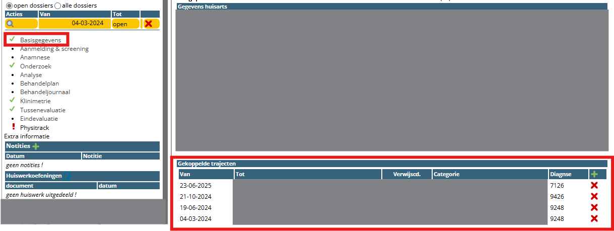 U kunt zien welke trajecten er aan een dossier hangen door het dossier te openen en bij basisgegevens onderaan te kijken: