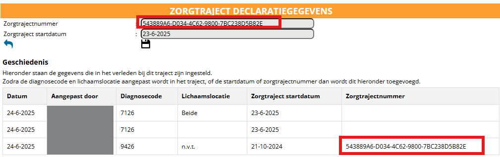 Als er iets verandert aan de startdatum, diagnosecode of lichaamslocatie, dan verandert ook het zorgtrajectnummer op de achtergrond. Dit is ook de bedoeling, want als een patiënt ineens declaraties voor een rechterelleboog stuurt, dan ziet de zorgverzekeraar dat als een nieuw zorgtraject en verwachten ze een nieuw zorgtrajectnummer.