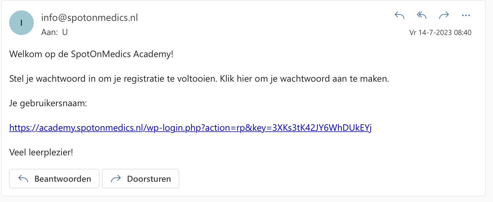 U ziet direct in uw scherm dat de registratie compleet is. Er is een e-mail vanuit onze info mailbox gestuurd, naar het ingevulde e-mailadres.
