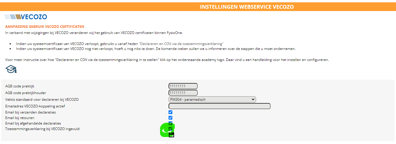 Zet na het instellen van de toestemmingsverklaringen het vinkje aan bij “Toestemmingsverklaring bij VECOZO ingevuld” en druk op opslaan.