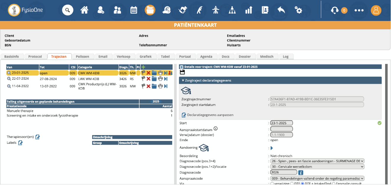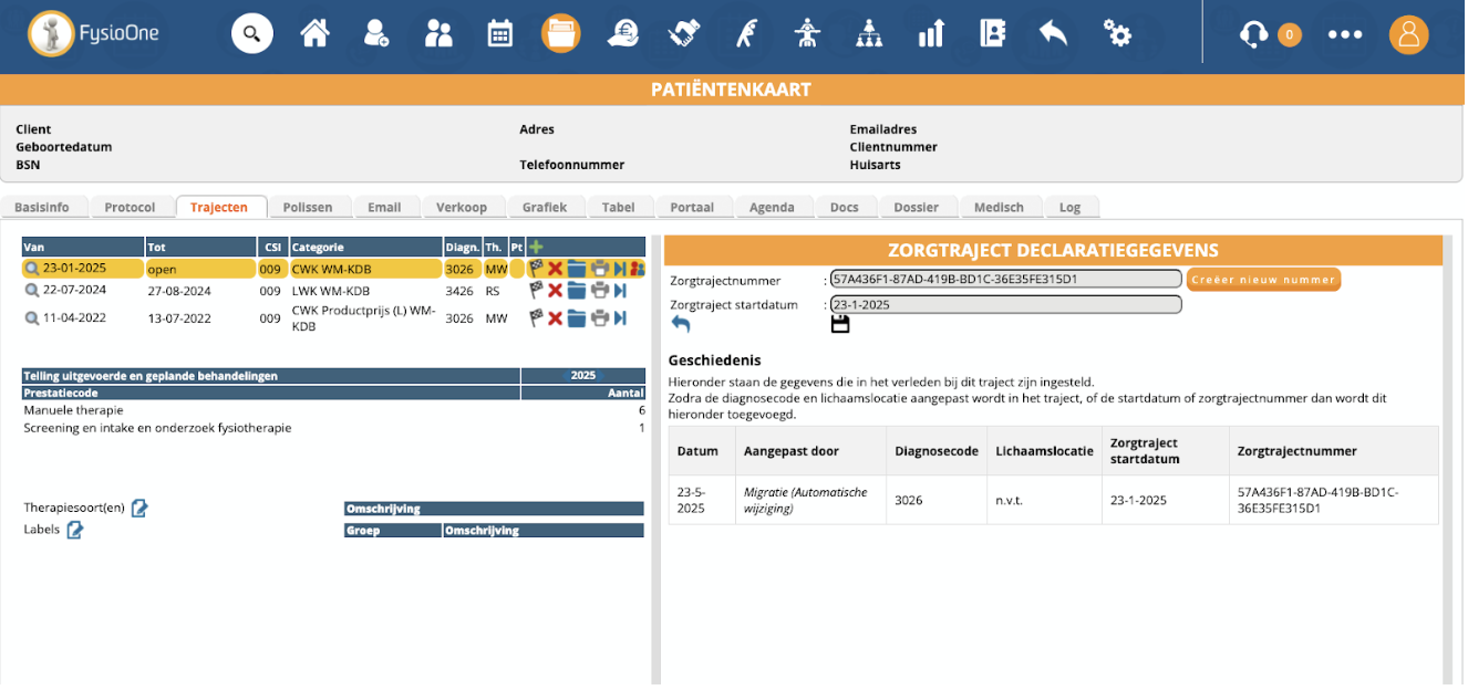 Indien er nog niet gedeclareerd is, zal het zorgtrajectnummer veld nog leeg zijn. Na het indienen van de eerste declaratie wordt deze data zichtbaar.