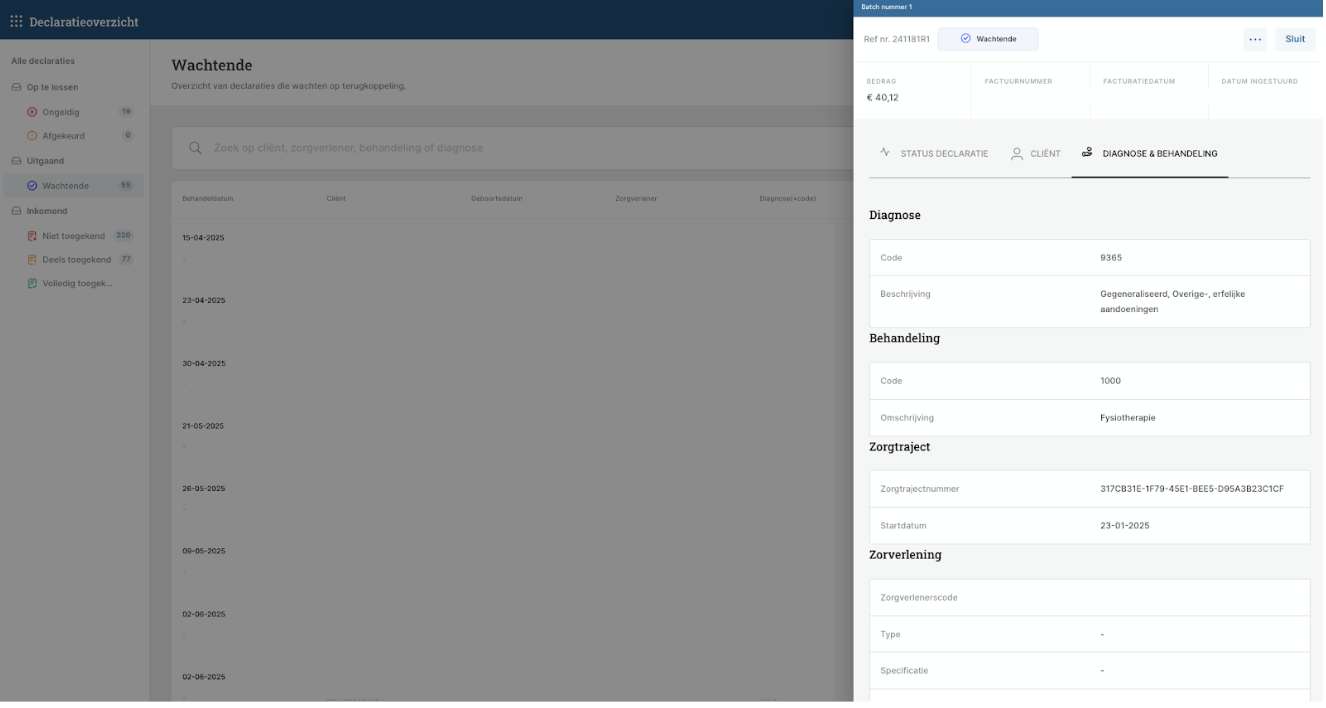 Het zorgtrajectnummer en zorgtraject startdatum waarmee een behandeling vanuit het traject is gedeclareerd, is in het nieuwe declaratie overzicht terug te vinden bij de details.