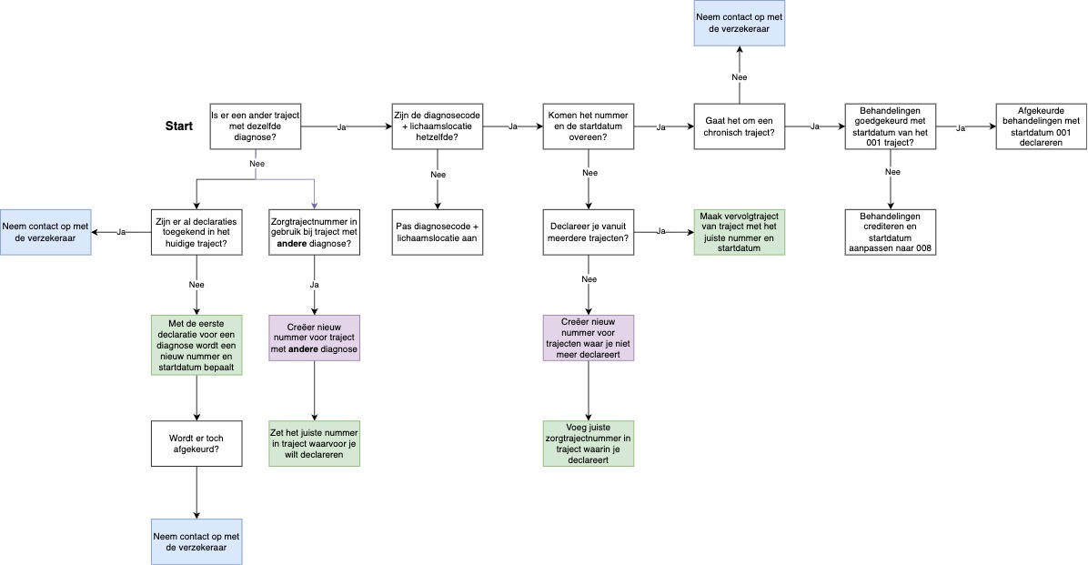 Per diagnose wordt hetzelfde zorgtrajectnummer en startdatum gebruikt. Declareer je vanuit een nieuw traject voor eenzelfde diagnose, dan krijgt deze automatisch hetzelfde zorgtrajectnummer en startdatum toegewezen. Bij dezelfde diagnose maar een nieuwe aandoening (bijvoorbeeld: patiënt valt voor de tweede keer op de knie, na afronding van een eerdere behandeling), dan dient er een nieuw behandel- of zorgtraject te worden gestart en krijgt het traject een nieuw zorgtrajectnummer en startdatum (creatie van het traject) toegewezen.